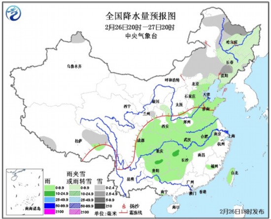 未来24小时最新预报为:今天夜间到明天白天,新疆北部、西藏东北部、陕西中北部、内蒙古中东部、东北地区大部、河北东北部等地有小到中雪或雨夹雪,其中,黑龙江中北部局地有大雪。西北地区东南部、华北东南部、黄淮大部、江淮中西部、江南地区西部和北部、四川盆地、贵州大部、广西北部、台湾等地有小到中雨。另外,内蒙古中东部、东北地区中南部有4~6级风。