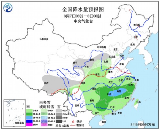 6日08时至7日08时,西藏东部、青海东部、川西高原北部、甘肃南部、宁夏南部等地有小雪或雨夹雪;陕西南部、黄淮西部、江汉、江淮、江南、华南、西南地区东部、台湾等地有小到中雨。内蒙古东部、东北等地有4~5级风。东海南部、台湾海峡有7~9级的风,东海北部、南海东北部有6~8级的风。