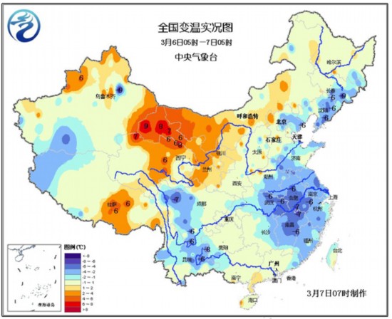南下的冷空气除使雨水增强外,也带来了明显的降温。今天凌晨5时,湖北东部、安徽南部、江西北部等地气温降幅达6℃以上,人体感觉阴冷。