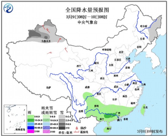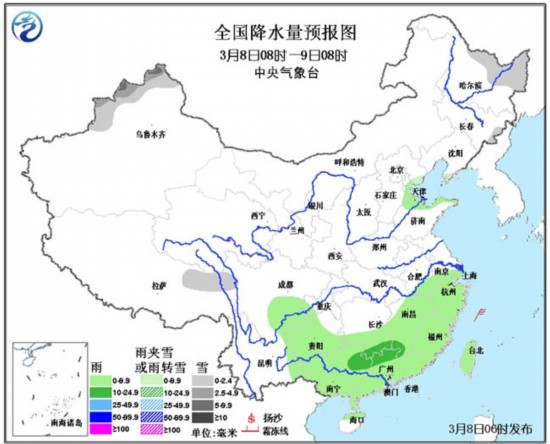 8日08时至9日08时,西藏东北部、新疆西部、黑龙江东部、辽东半岛南部、河北东北部等地有小雪或雨夹雪;天津、山东北部、西南地区东部、江南南部和东部、华南等地有小到中雨。东海南部海域将有7~8级、阵风9级的旋转风。