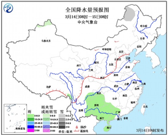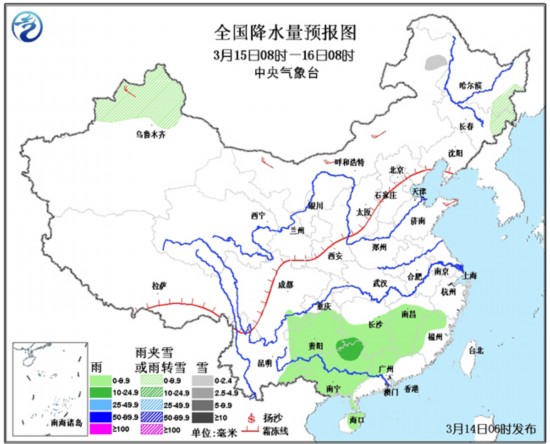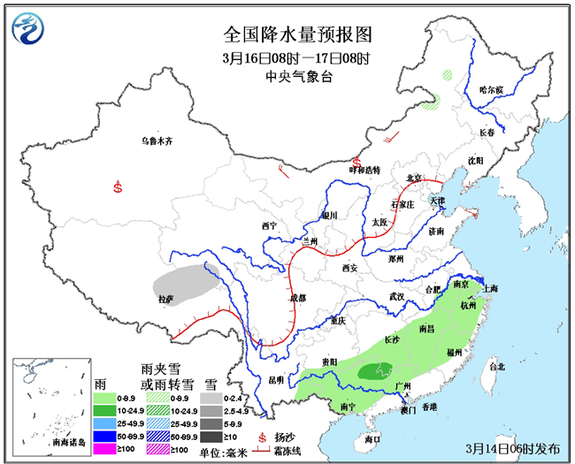16日08时至17日08时,西藏东北部、青海南部等地有小雪或雨夹雪;江南中南部和东部、广西、广东西部、云南东部等地有小到中雨。此外,南疆盆地、内蒙古中部等地有浮尘或扬沙。内蒙古中西部等地有4-6级风。