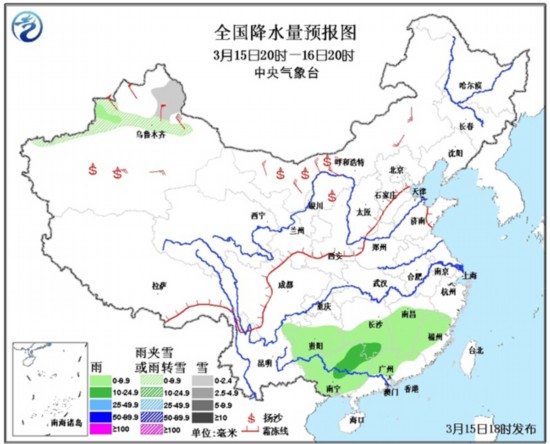 预计未来24小时,影响我国的降水势力仍旧较弱。具体预报为,今天夜间到明天白天,新疆北部等地有小雪或雨夹雪天气,江南中南部、华南中西部、贵州中南部等地有小到中雨。另外,新疆北部、内蒙古中西部等地有4~6级风,山口地区风力可达8级。