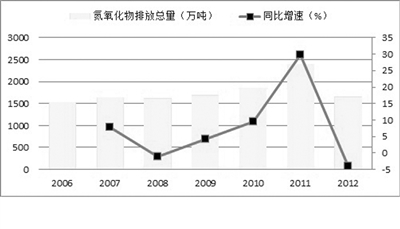 近年来,我国废气排放治理初见成效,具体而言:2012年二氧化硫排放总量2117万吨,同比下降4.52%,总体呈下降趋势,但其排放量超过环境容量一倍,且远高于美国1036万吨和欧盟27国568万吨的水平;氮氧化物排放总量为2338万吨,较2011年的2404万吨下降2.77%,其中工业源排放占比70.93%,其次是机动车排放占比27.38%。