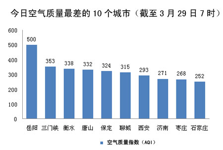 人民网北京3月29日电 (记者 杜燕飞)根据环保部公布的最新数据,截至今日早上7时,岳阳的AQI(空气质量指数)“爆表”,达到500,属于六级严重污染,成为161个参与空气质量排名的城市中空气质量最差的城市。