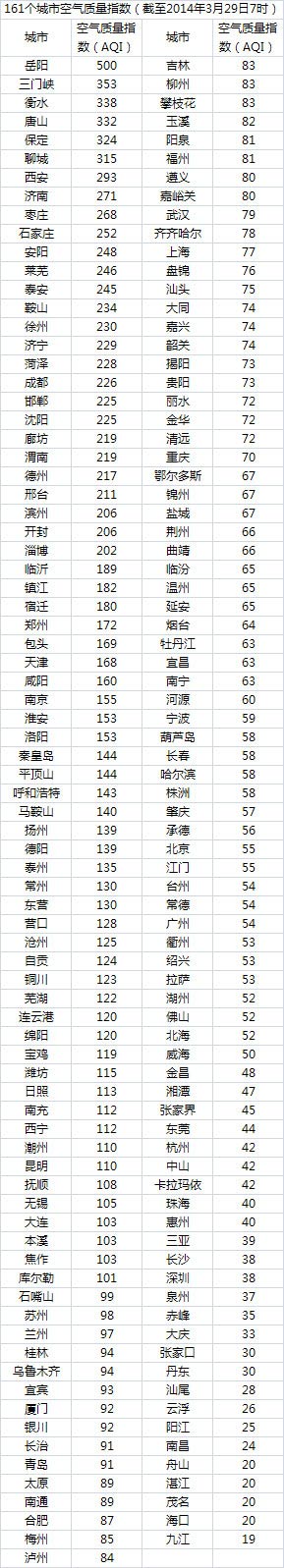 说明:自2014年1月1日起,环保部发布空气质量实时信息、空气质量月报及参与空气质量排名的地级城市已由74个增加到161个,包含了直辖市、省会城市、计划单列市、“三区”所有地级城市、环保重点城市和环保模范城市。人民网环保频道将采用环保部的官方数据,对161个城市每日空气质量进行排行。