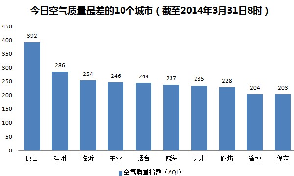 人民网北京3月31日电 (杨翼)根据环保部公布的最新数据,截至今天早上8时,唐山的AQI(空气质量指数)达到392,属于严重污染,成为161个参与空气质量排名的城市中空气质量最差的城市。今日空气质量最差的10个城市分别是唐山、滨州、临沂、东营、烟台、威海、天津、廊坊、淄博和保定。滨州、临沂、东营、烟台、威海、淄博等6个城市属于山东省。
