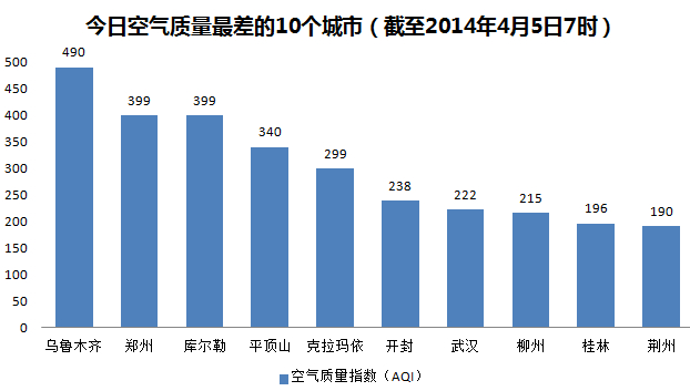 人民网北京4月5日电 (杨翼)根据环保部公布的最新数据,截至今天早上7时,乌鲁木齐的AQI(空气质量指数)为490,属于六级严重污染,成为161个参与空气质量排名的城市中空气质量最差的城市。今日空气质量最差的10个城市分别是乌鲁木齐、郑州、库尔勒、平顶山、克拉玛依、开封、武汉、柳州、桂林和荆州。其中乌鲁木齐、郑州、库尔勒、平顶山等四城市属于重度霾。
