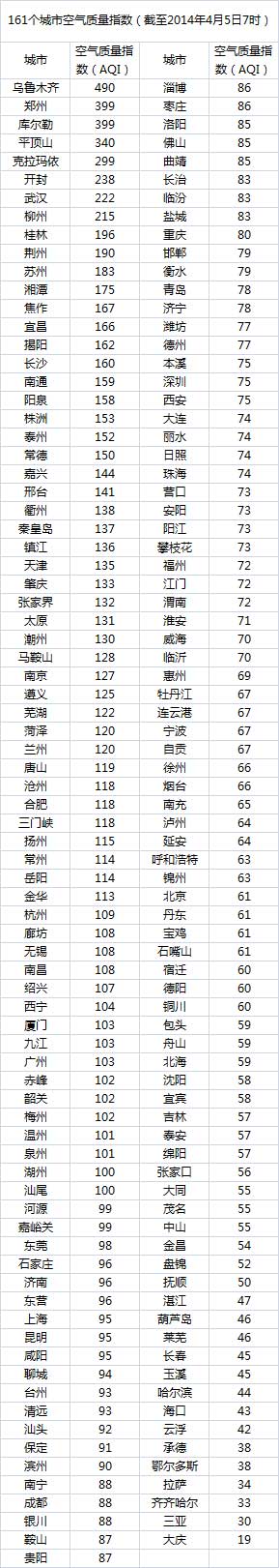 说明:自2014年1月1日起,环保部发布空气质量实时信息、空气质量月报及参与空气质量排名的地级城市已由74个增加到161个,包含了直辖市、省会城市、计划单列市、“三区”所有地级城市、环保重点城市和环保模范城市。人民网环保频道将采用环保部的官方数据,对161个城市每日空气质量进行排行。(实习生 朱宁君)
