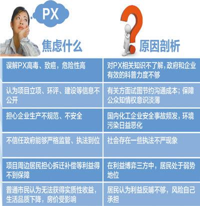 2013年,人民日报《求证》栏目曾关注PX产业发展问题,调研了解公众对PX敏感主要是担心企业安全生产管理和政府安全监管的缺失。