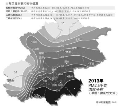 公报还首次对全市16个区县和北京经济技术开发区的PM2.5年均浓度进行了通报:全市PM2.5浓度最高的区县是大兴区,PM2.5年均浓度值为107.8微克/立方米,其次是房山、通州以及北京经济技术开发区,年均浓度值均超过100微克/立方米,PM2.5年均浓度最低的区县是延庆县,只有68微克/立方米。位于北部、西北部的生态涵养发展区明显好于其他区域。