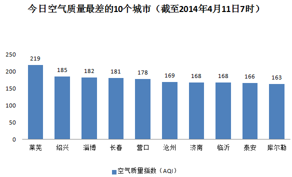 人民网北京4月11日电 (杨翼)根据环保部公布的最新数据,截至今天早上7时,莱芜的AQI(空气质量指数)219,属于重度污染,成为161个参与空气质量排名的城市中空气质量最差的城市。今日空气质量最差的10个城市分别是莱芜、绍兴、淄博、长春、营口、沧州、济南、临沂、泰安和库尔勒。全国仅莱芜1个城市属于重度污染。