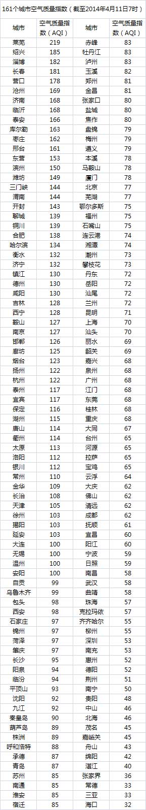 说明:自2014年1月1日起,环保部发布空气质量实时信息、空气质量月报及参与空气质量排名的地级城市已由74个增加到161个,包含了直辖市、省会城市、计划单列市、“三区”所有地级城市、环保重点城市和环保模范城市。人民网环保频道将采用环保部的官方数据,对161个城市每日空气质量进行排行。