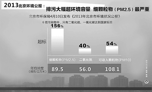 北京市环保局通报,2013年,北京市主要污染物排放总量提前两年动态完成国家下达的“十二五”污染减排任务。6项污染物中有两项达到国家标准,分别是二氧化硫和一氧化碳;4项污染物超标,其中细颗粒物(PM2.5)年均浓度每立方米89.5微克, 超标156%,二氧化氮超标40%;可吸入颗粒物(PM10)超标54%,臭氧超标14.6%。从趋势看,过去5年里,二氧化硫和可吸入颗粒物仍呈显著下降趋势,二氧化氮持平。