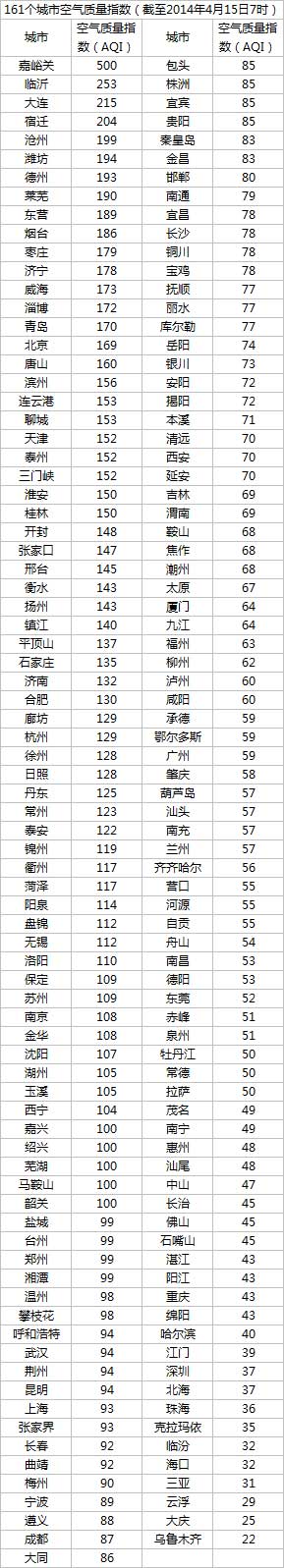 说明:自2014年1月1日起,环保部发布空气质量实时信息、空气质量月报及参与空气质量排名的地级城市已由74个增加到161个,包含了直辖市、省会城市、计划单列市、“三区”所有地级城市、环保重点城市和环保模范城市。人民网环保频道将采用环保部的官方数据,对161个城市每日空气质量进行排行。(实习生 朱宁君)