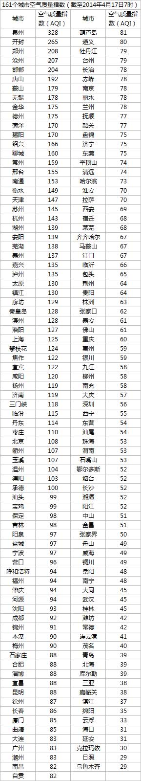 说明:自2014年1月1日起,环保部发布空气质量实时信息、空气质量月报及参与空气质量排名的地级城市已由74个增加到161个,包含了直辖市、省会城市、计划单列市、“三区”所有地级城市、环保重点城市和环保模范城市。人民网环保频道将采用环保部的官方数据,对161个城市每日空气质量进行排行。(实习生 朱宁君)