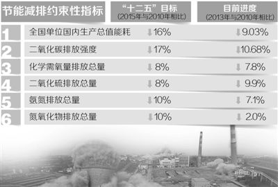 4月21日在北京举行的十二届全国人大常委会第八次会议上,受国务院委托,国家发展和改革委员会主任徐绍史作了关于节能减排工作情况的报告。他介绍,根据“十二五”规划纲要,节能减排约束性指标共有6个,具体要求是:2015年与2010年相比,全国单位国内生产总值能耗降低16%,二氧化碳排放强度下降17%,化学需氧量和二氧化硫排放总量分别下降8%,氨氮、氮氧化物排放总量分别下降10%。