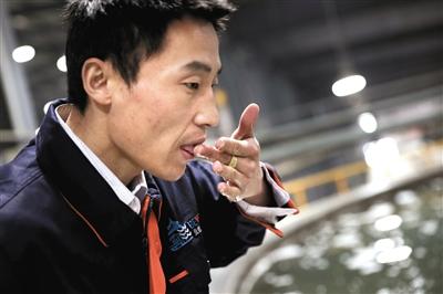 车间内,一名巡视工人用手蘸点气浮池内的海水品尝,判断海水有无异味。