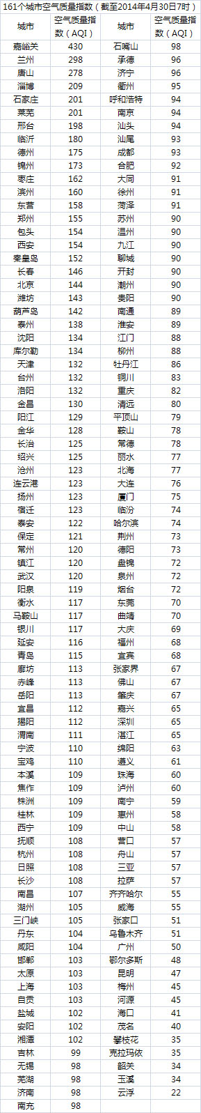 人民网北京4月30日电(记者蒋琪) 根据环保部公布的最新数据,今天嘉峪关的AQI(空气质量指数)达到430,成为161个参与空气质量排名的城市中空气质量最差的城市。截至今天早上7时,今日空气质量最差的10个城市分别是嘉峪关、兰州、唐山、淄博、石家庄、莱芜、邢台、临沂、德州、银川,其中兰州、唐山、淄博、石家庄、莱芜为重度及重度以上污染的城市。
