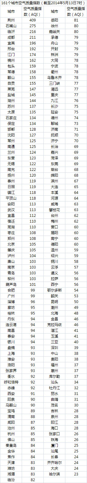 说明:自2014年1月1日起,环保部发布空气质量实时信息、空气质量月报及参与空气质量排名的地级城市已由74个增加到161个,包含了直辖市、省会城市、计划单列市、“三区”所有地级城市、环保重点城市和环保模范城市。人民网环保频道将采用环保部的官方数据,对161个城市每日空气质量进行排行。