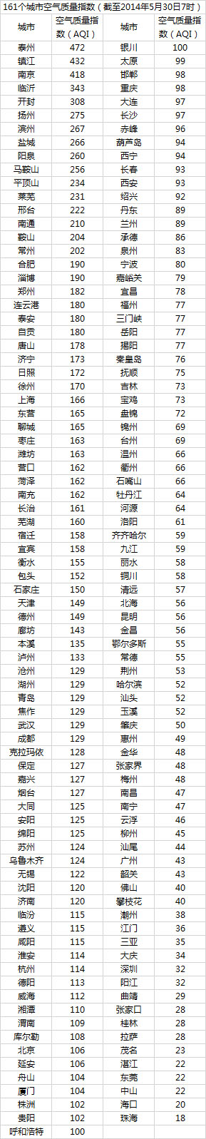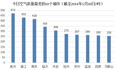 人民网北京5月30日电 (蒋琪)根据环保部公布的最新数据,截至今天早上7时,泰州的AQI(空气质量指数)达到472,属于六级严重污染,成为161个参与空气质量排名的城市中空气质量最差的城市。今日空气质量最差的10个城市分别是泰州、镇江、南京、临沂、开封、扬州、滨州、盐城、阳泉、马鞍山。其中泰州、镇江、南京、扬州、盐城等5个城市属于江苏省。其中泰州、镇江、南京、临沂、开封都属于六级严重度污染。