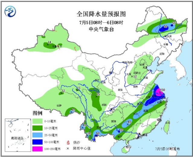 人民网北京7月5日电 (杨翼)中央气象台今晨6时继续发布暴雨黄色预警:预计,今天白天到夜间,江苏大部、上海、安徽南部、浙江北部、江西北部、湖南中部和西南部、广西东北部和西部、云南南部和西部、黑龙江中部和西南部等9省市局地有大雨或暴雨,其中,江苏中南部的部分地区有大暴雨(100~150毫米);上述地区局地并伴有短时雷雨大风等强对流天气。