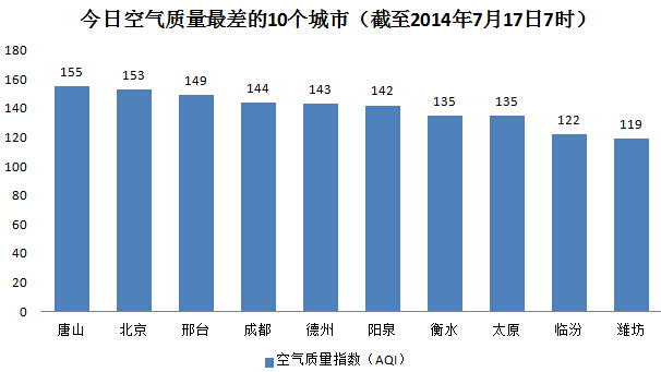 人民网北京7月17日电 (杨翼)根据环保部公布的最新数据,截至今日早上7时,唐山的AQI(空气质量指数)为155,属于中度污染,成为161个参与空气质量排名的城市中空气质量最差的城市。今日空气质量最差的10个城市分别是唐山、北京、邢台、成都、德州、阳泉、衡水、太原、临汾和潍坊。