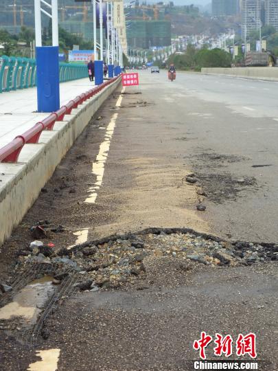 中新网纳雍7月18日电 (张丹莉)近日,连续暴雨,贵州省毕节市纳雍县发展大道的控制性工程雍阳大桥桥面出现了多处不同程度的皲裂、变形,变形隆起最高处与正常桥面的垂直距离达20厘米左右。