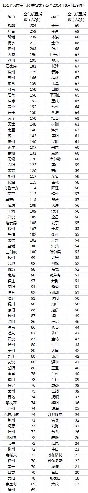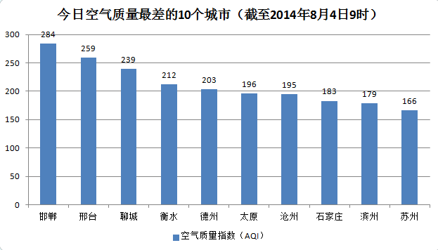 人民网北京8月4日电 根据环保部公布的最新数据,截至今日早上9时,邯郸的AQI(空气质量指数)为284,属于重度污染,成为161个参与空气质量排名的城市中空气质量最差的城市。今日空气质量最差的10个城市分别是邯郸、邢台、聊城、衡水、德州、太原、沧州、石家庄、滨州、苏州。(实习生 江小月)
