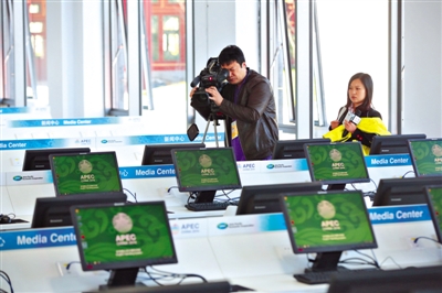 APEC会议雁栖湖新闻中心昨日首次对外亮相,该中心占地约9000平方米,内设服务台、工作区、餐饮区、文化展示区等15个工作区。新京报记者 侯少卿 摄