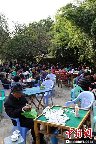 11月5日,成都持续晴朗天气,告别多日雾霾天气,民众纷纷出门选择各种户外活动。图为成都一公园内,民众喝坝坝茶打牌闲聊。中新社发 张浪 摄