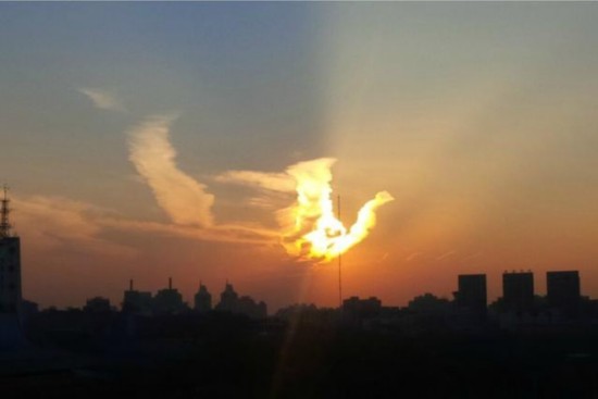 12月23日傍晚,北京西部天空呈现奇异而美丽的晚霞,天空的彩云宛若一只巨大的凤凰遨游天际,美不胜收。网友飘飘M10摄