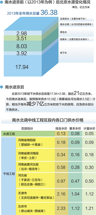 日前国家发改委对外发布《关于南水北调中线一期主体工程运行初期供水价格政策的通知》规定,中线工程实行两部制水价,基本水价按合理偿还贷款本息、适当补偿工程基本运行维护费用的原则制定,计量水价按补偿基本水价以外的其他成本费用及计入规定税金的原则制定。基本水费按基本水价乘以规划分配的分水口门净水量计算,计量水费按计量水价乘以实际口门用水量计算。水源工程和干线工程各口门基本水价、计量水价可在国家发改委网站上查询。