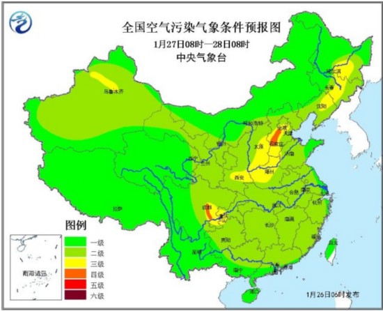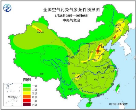 27日08时~28日08时,受冷空气和降水的共同影响,中东部大部地区的空气污染气象条件在3级以下,其中华北中南部、黄淮西北部、东北地区中部等地为3~4级,有轻度霾。