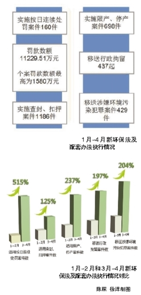 环境保护部环境监察局局长邹首民介绍,根据1月~4月调度情况,全国范围内实施按日连续处罚案件共160件,罚款数额达11229.51万元,个案罚款数额最高为1580万元;实施查封、扣押案件共1186件;实施限产、停产案件共698件;移送行政拘留共437起,移送涉嫌环境污染犯罪案件共429件。其中,河南实施按日连续处罚26件,罚款金额共计2911.59万元;江苏实施按日连续处罚24件,罚款金额共计988.13万元;内蒙古实施按日连续处罚20件,罚款金额共计600万元;辽宁实施按日连续处罚18件,罚款金额共计839万元;河北实施按日连续处罚8件,罚款金额共计1414.68万元;陕西实施按日连续处罚5件,罚款金额共计1869.86万元,个案罚款数额最高为1580万元。浙江实施查封、扣押496件,占全国1月~4月查封、扣押案件总数的42%;移送行政拘留98件。广东省实施查封、扣押154件。江西实施限产、停产99件。