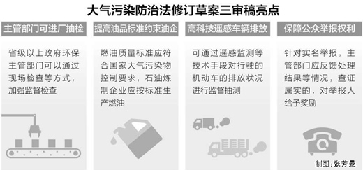 为了从源头上解决机动车大气污染问题,此次提交审议的三审稿增加规定:一是制定燃油质量标准,应当符合国家大气污染物控制要求,二是石油炼制企业应当按照燃油质量标准生产燃油。“我国的燃油质量标准落后于机动车排放标准,无论是国四标准,还是国五标准,烯烃和芳烃的含量定得过高,而二者是PM2.5的重要来源。因此,应当提高燃油质量标准。”部分常委会组成人员表示。