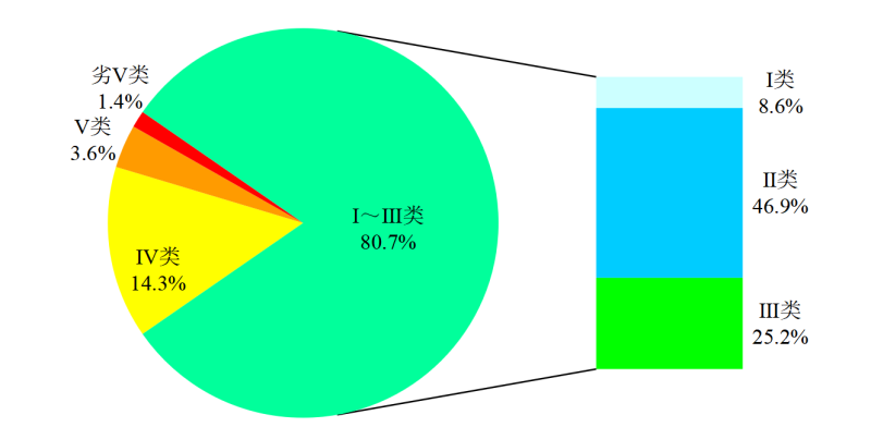 1-5月,1940个国家地表水考核断面中,水质优良(Ⅰ-Ⅲ类)断面比例为80.7%,同比上升6.0个百分点;劣Ⅴ类断面比例为1.4%,同比下降3.5个百分点。主要污染指标为化学需氧量、总磷和高锰酸盐指数。