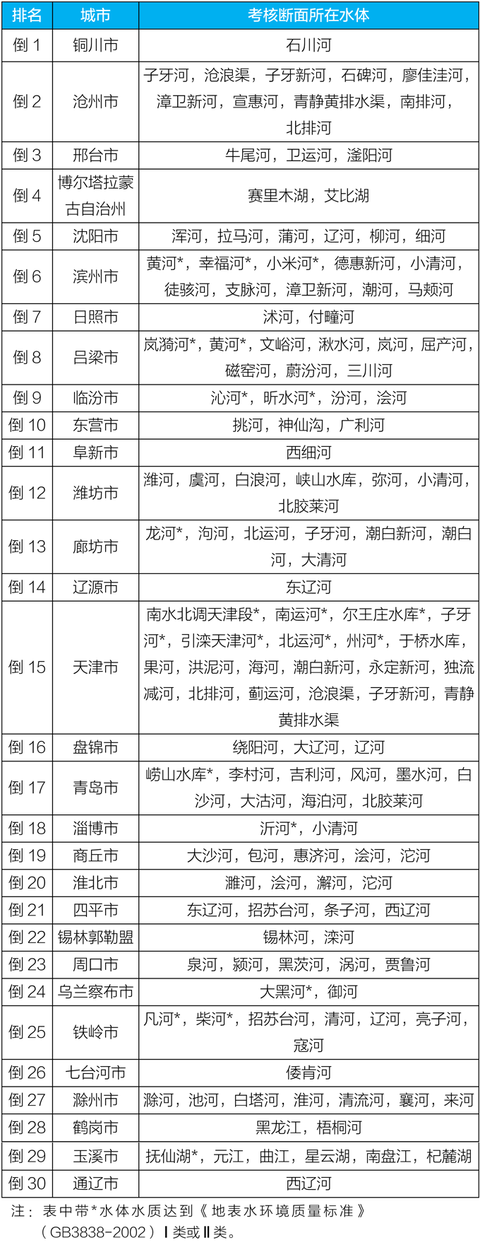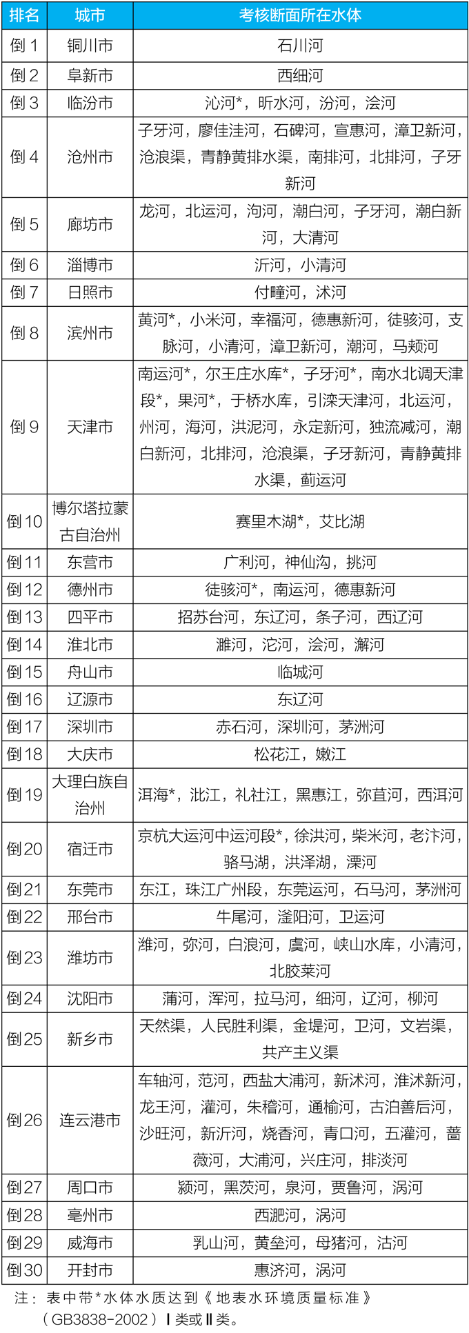 2020年5月国家地表水考核断面水环境质量状况排名后30位城市及所在水体