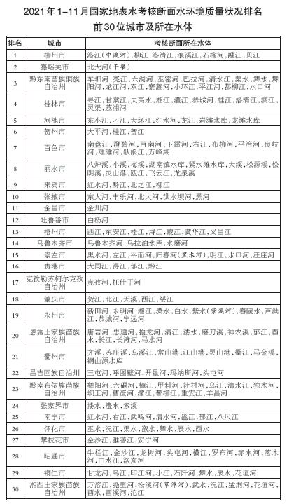 1月-11月,全国地级及以上城市中,柳州、嘉峪关和黔东南等30个城市国家地表水考核断面水环境质量相对较好(从第1名至第30名),乌兰察布、赤峰和临汾等30个城市国家地表水考核断面水环境质量相对较差(从倒数第1名至倒数第30名)。