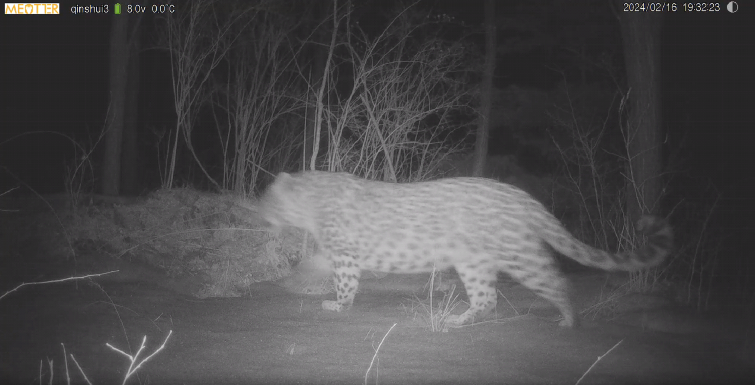 2024年2月16日,大年初七,科研人员收到一条实时回传的影像数据,在回传的影像当中清晰可见一只华北豹的活动影像。该影像是布设在沁水县后洞沟村附近的红外相机拍摄到的。这头成年华北豹体型健硕,体态优美,散发着顶级掠食者独具的霸气从容。