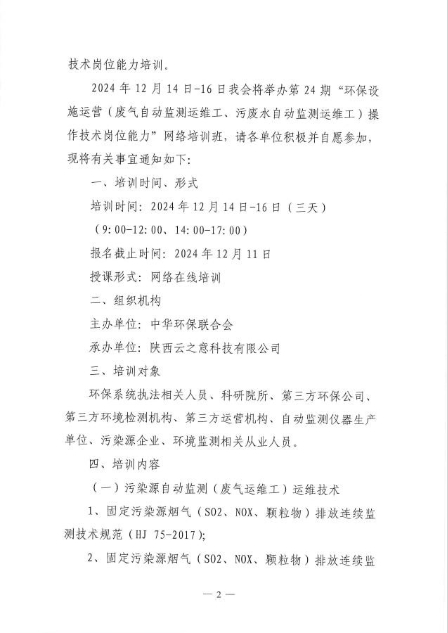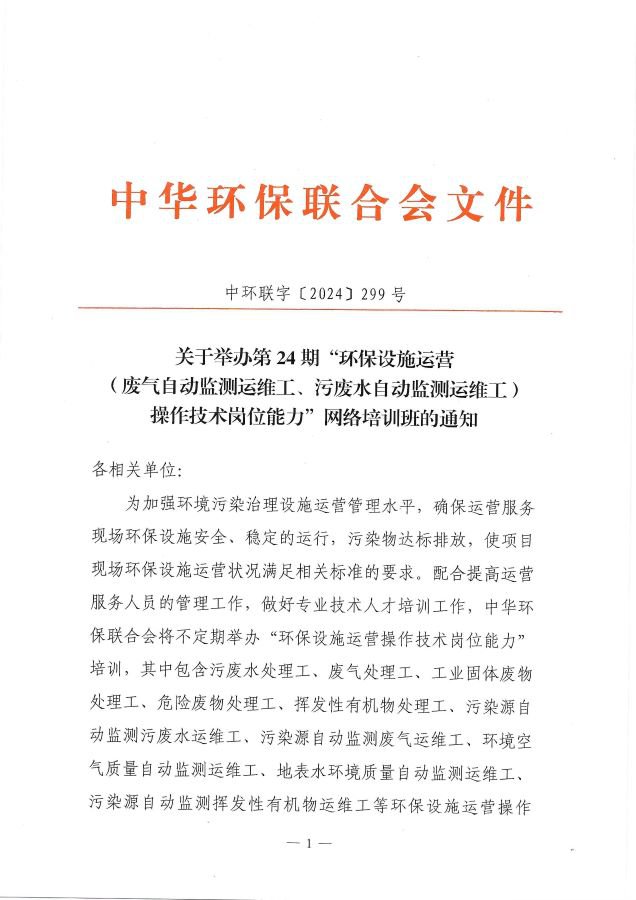关于举办第24期“环保设施运营(废气自动监测运维工、污废水自动监测运维工)操作技术岗位能力”网络培训班的通知