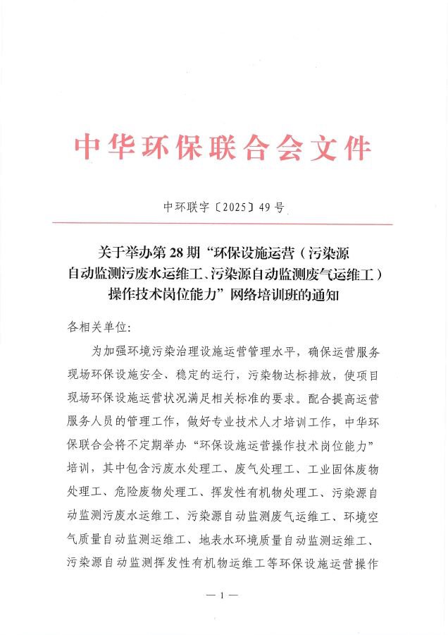 关于举办第28期“环保设施运营(污染源自动监测污废水运维工、污染源自动监测废气运维工)操作技术岗位能力”网络培训班的通知