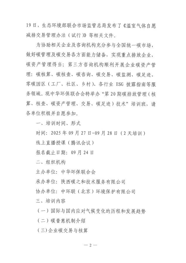 关于举办第20期“碳排放管理(核算、核查、碳资产管理、交易、碳足迹)技术培训班”的通知